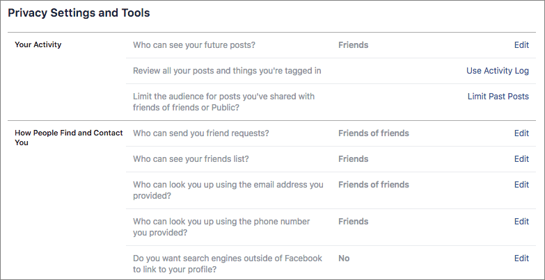 Also, go to Facebook’s Privacy Settings & Tools page. Click the Edit button next to each item, and make it as specific as you can. You also might want to review the posts you’re tagged in and remove those that you don’t want on your timeline.