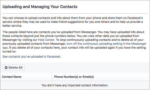 But what if you don’t want to give information to Facebook for it to use? Go to Facebook’s page for Uploading and Managing Your Contacts, and delete them all. You’re just giving away your contacts’ personal information without their permission otherwise.