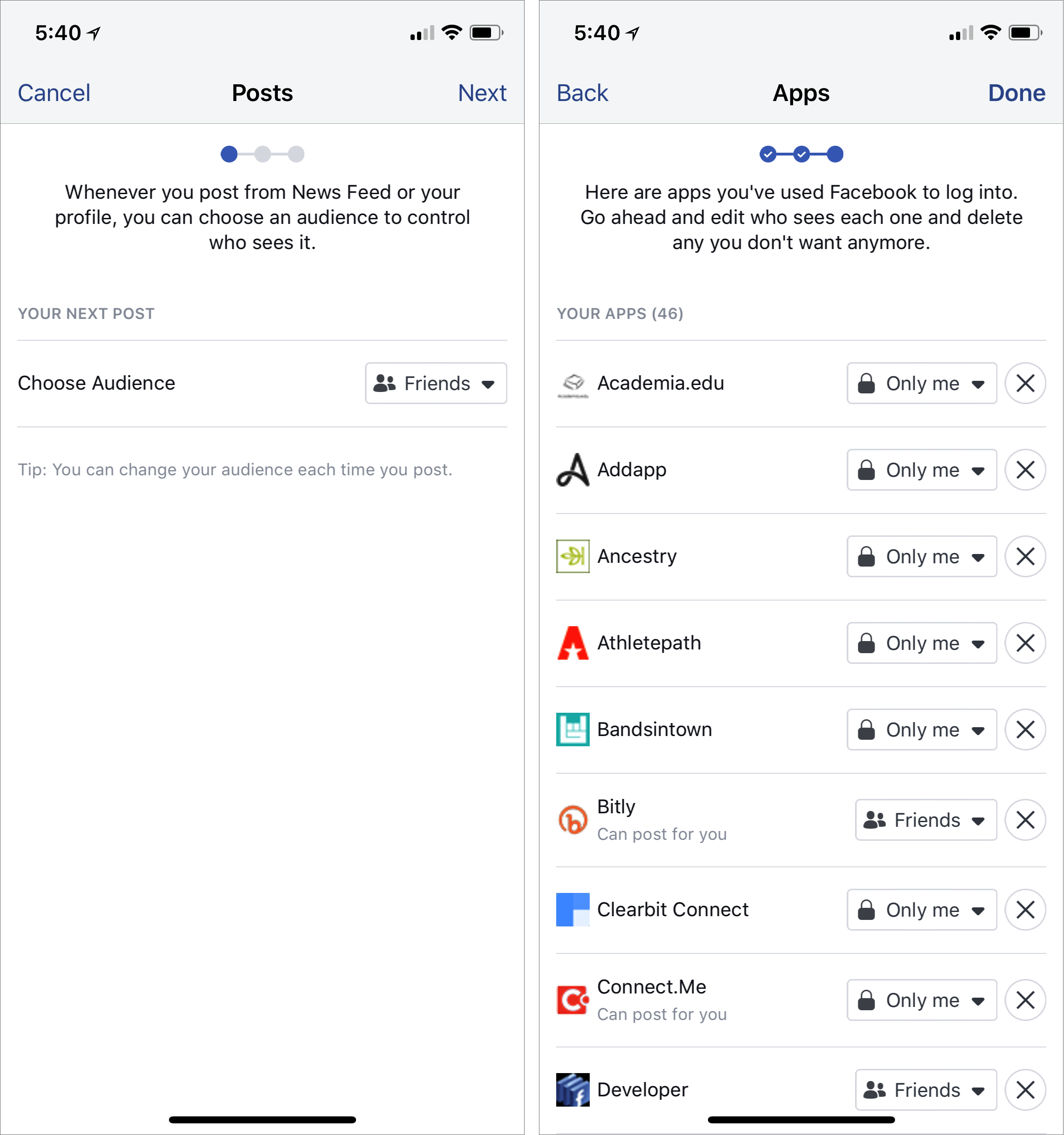 To control who on Facebook can see what you share, click the ? button on the Facebook Web site on your Mac, or tap the hamburger button in the bottom right corner of the Facebook iOS app and tap Privacy Shortcuts. Then click or tap Privacy Checkup and run through the steps to make sure you’re sharing the right info with the right people. Be sure to lock down or remove any apps that you don’t need, since they can leak all sorts of data.