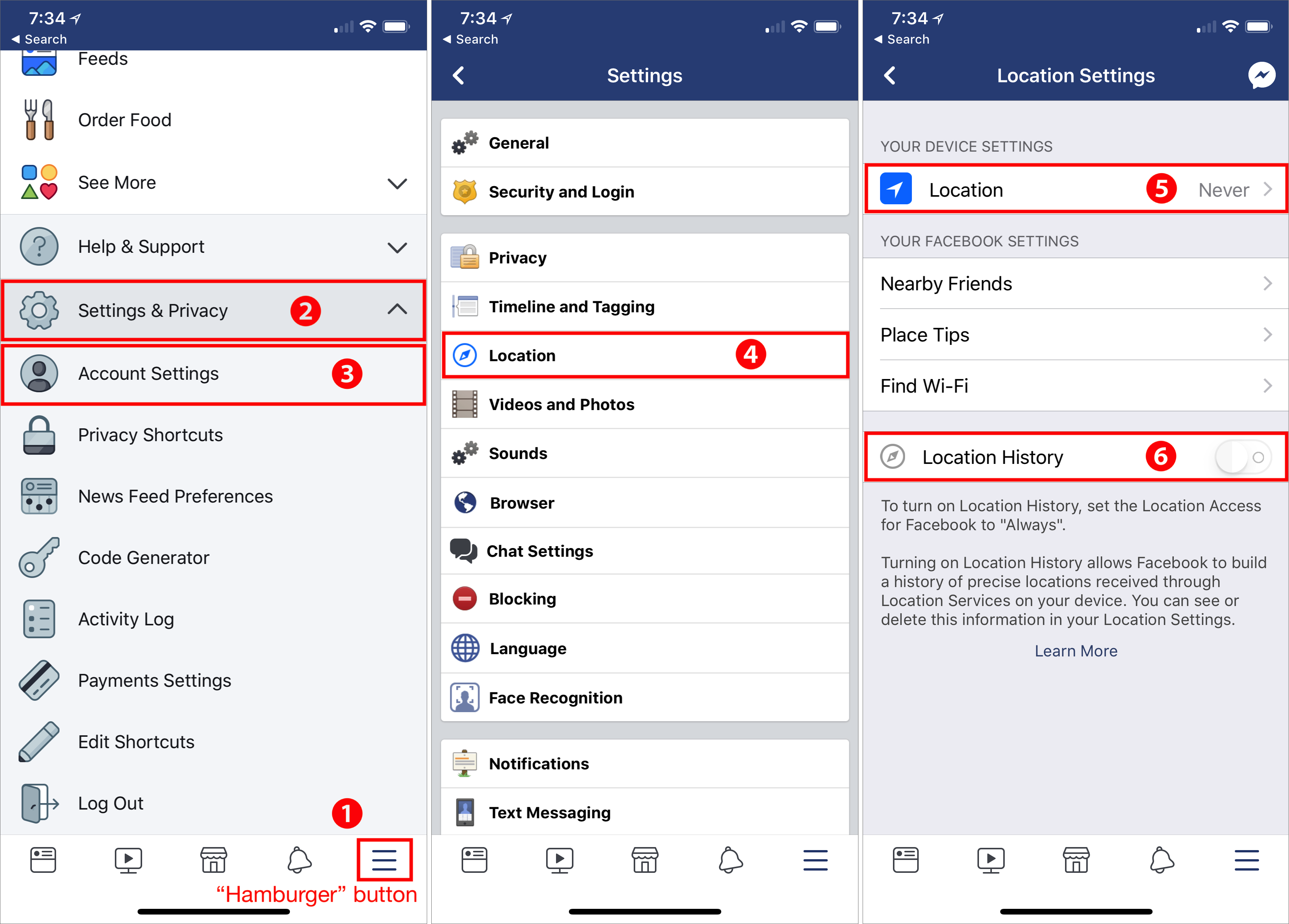 Also, in the iPhone Facebook app, tap the hamburger button again and then Settings & Privacy > Account Settings > Location > Location, and make sure it’s set to Never. And whatever you do, keep Location History off—Facebook doesn’t need to know everywhere you’ve ever been.