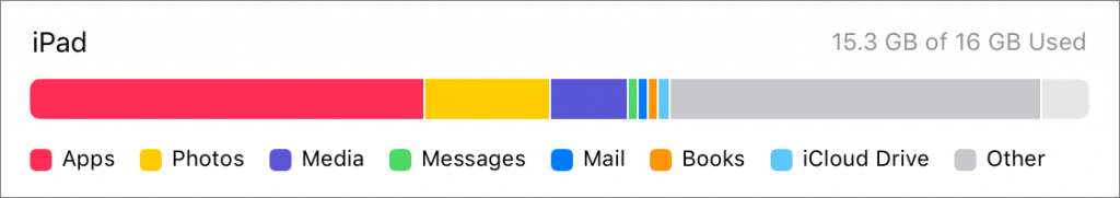 To get started clearing space, go to Settings > iPhone/iPad Storage. At the top of the screen, a graph reveals where your space is going, such as Apps, Photos, Media, Messages, Mail, Books, iCloud Drive, and Other. You can’t do anything with the graph, but it will likely reveal the main culprits.