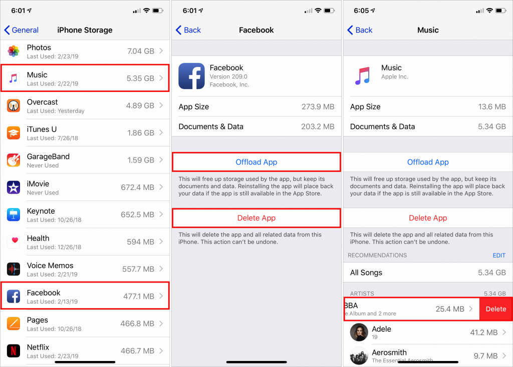 When you tap an app, iOS shows more information about how much space the app and its documents occupy, and lets you tap Offload App or Delete App to recover its space. For some apps, mostly those from Apple, like Music and Podcasts, iOS also shows the data stored by the app and lets you delete any individual item (swipe left).
