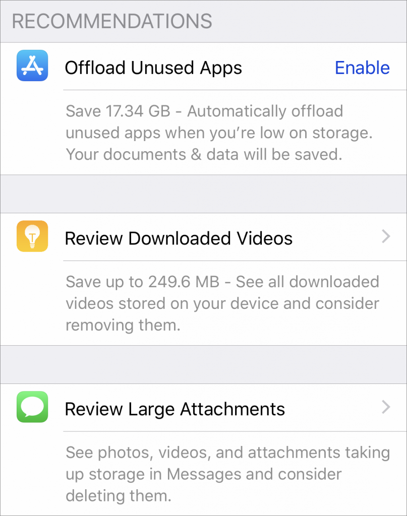 Next, iOS shows recommendations for quick ways to recover space. These vary based on how you use your device, so you will likely see other options here.