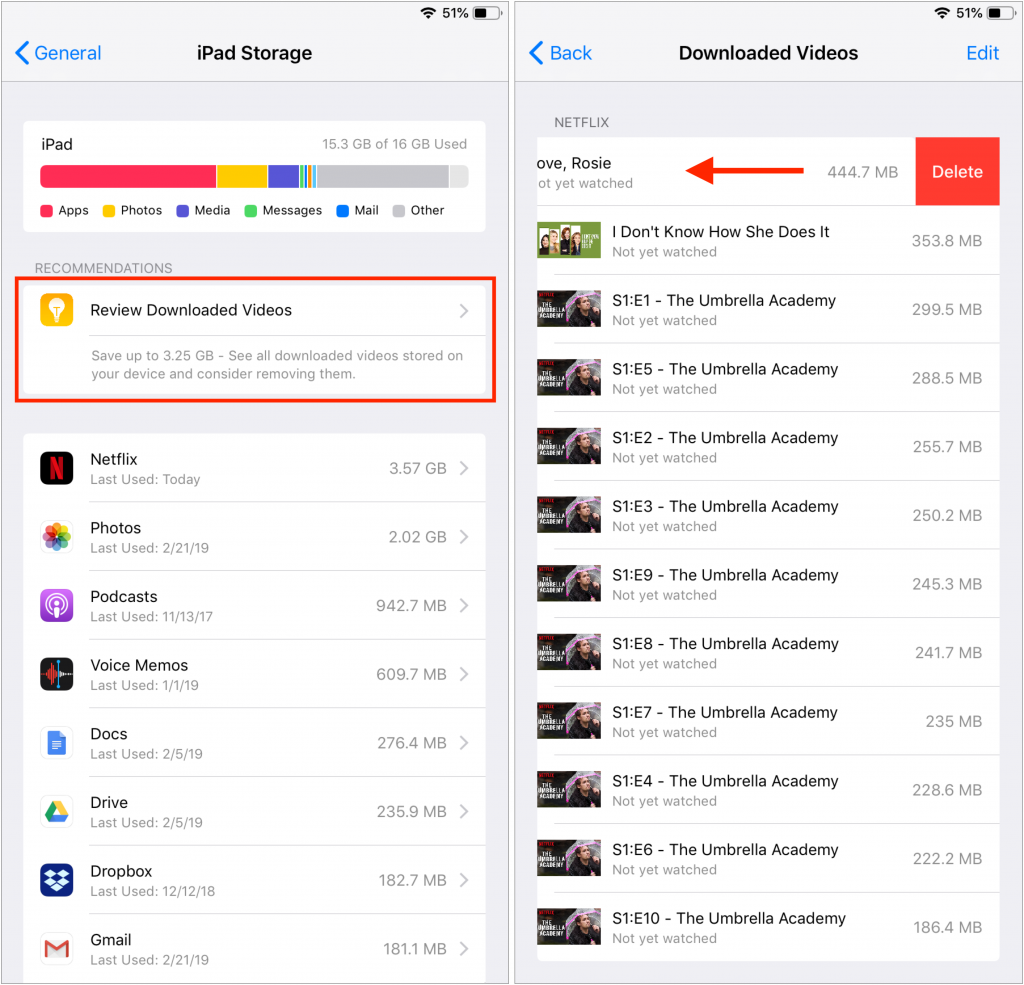 Offload Unused Apps: This choice is particularly helpful if you download a lot of apps that you later stop using. Enable it, and iOS automatically recovers space from unused apps when you’re low on storage. Each of these apps remains on your Home screen with a little cloud icon next to it, and when you next tap the app to open it, iOS re-downloads the app from the App Store. You won’t lose any documents, data, or settings associated with an offloaded app.- Review Downloaded Videos: Some apps, like Netflix, can download videos for offline watching. That’s great for when you’re on a long flight, but if you forget to delete the videos, they can consume a lot of space. This option shows them to you and lets you swipe left on any one to delete it.